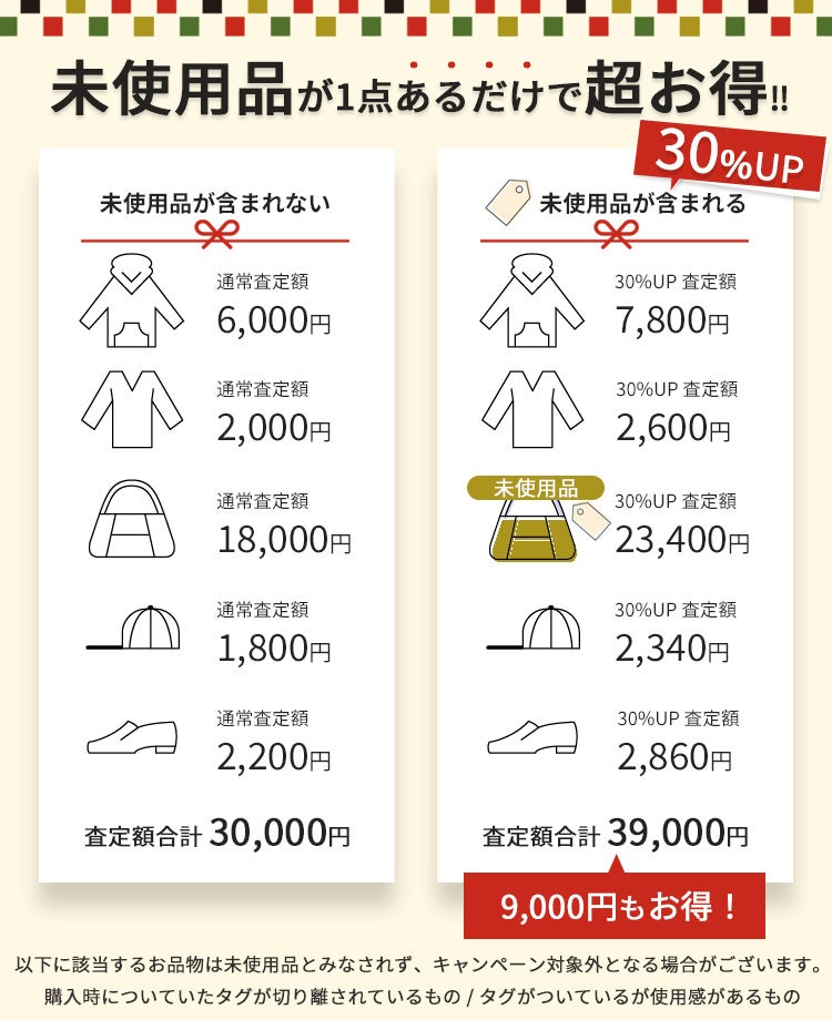 タグ付き未使用品を1点でもお送りいただければ、全ての査定額が30%アップの対象となります。クローゼットの中にある不要な服や季節外れのアイテム、他社で査定額が低いと感じたお品物も一緒にまとめてお送りください。