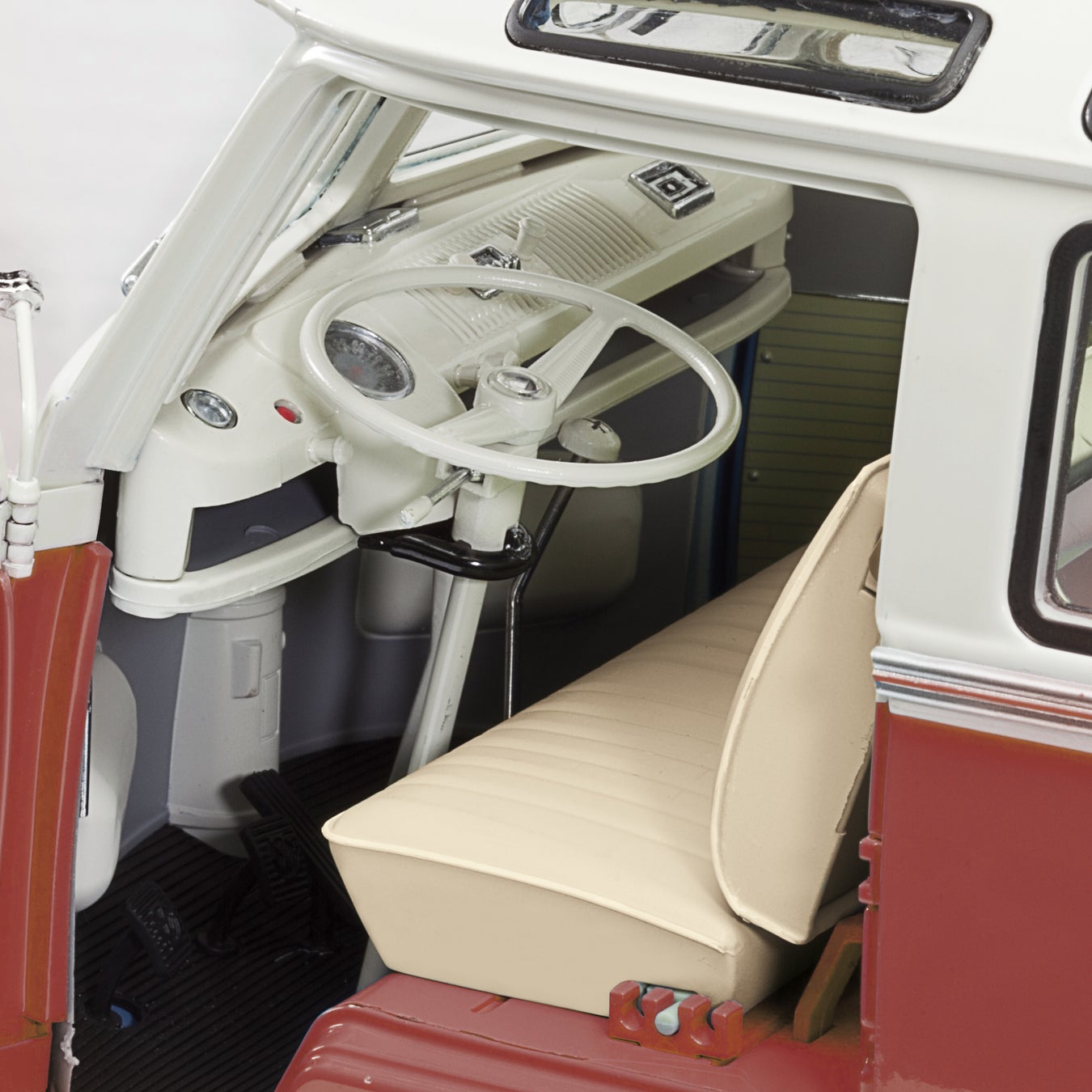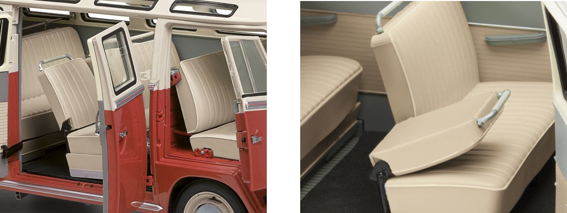 モデルの各パーツの色は、ドイツのヴォルフス ブルクにある「フォルクスワーゲン・オートミュージアム」に展示されている”Volkswagen T1 Samba Bus”を参考に、ステアリングや給油口にいたるまで、リアリティを追求して再現しています