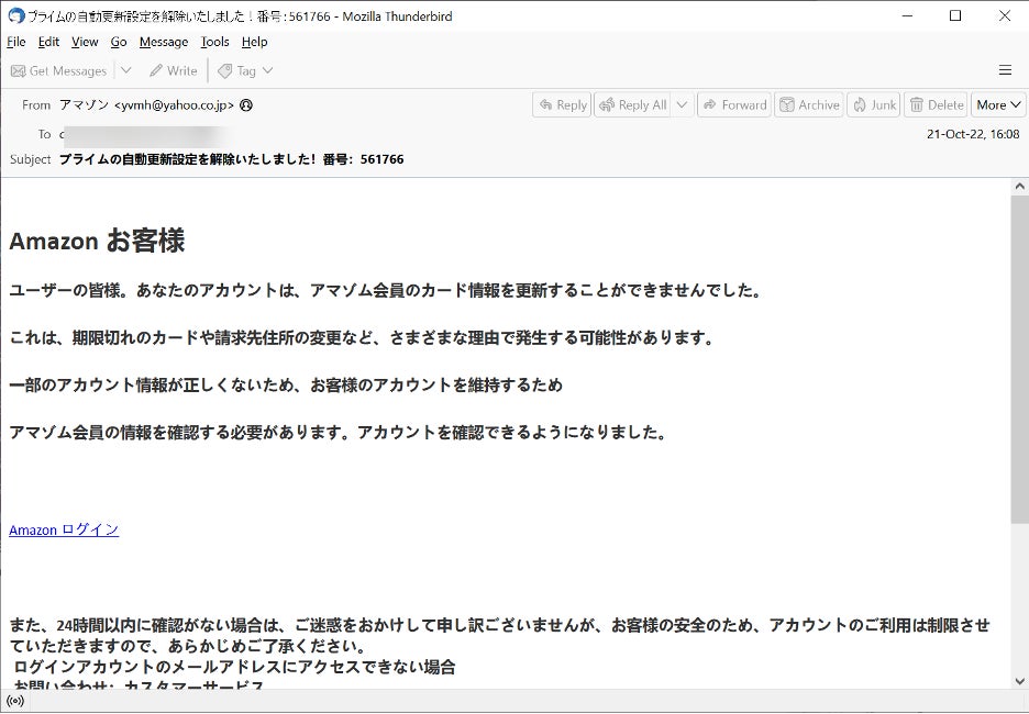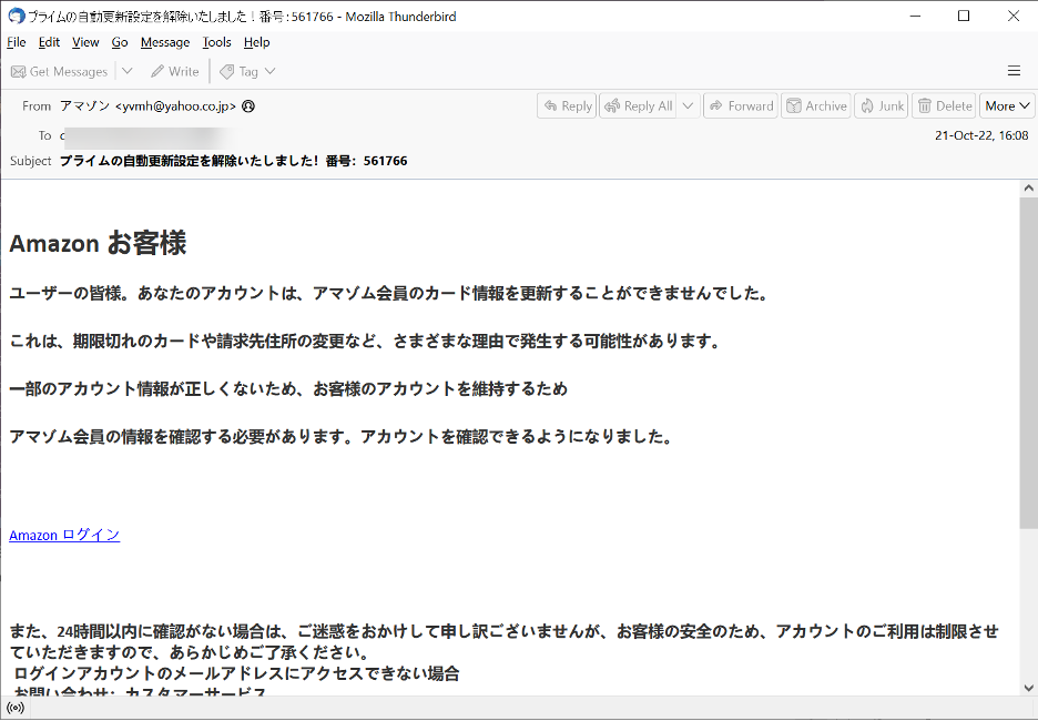 この攻撃では、認証情報を得ることを目的として、ハッカーが偽のAmazonアカウントの通知を送信します。