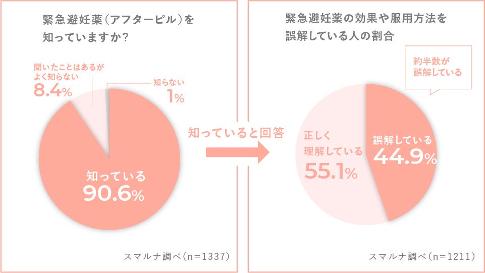 緊急避妊薬(アフターピル)を知っていると回答した人は90.6%。しかし、うち約半数が緊急避妊薬について間違った認識を持っている