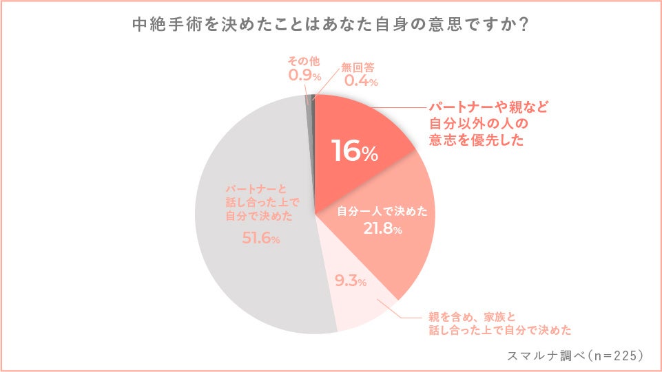 続いて、中絶手術を決めたときの意思決定について聞いてみると、最も高かったのは「パートナーと話し合った上で自分で決めた」(51.6%)、一方で「(自分は産むことを希望したが)パートナーや親など自分以外の人の意志を優先した」が16%いることもわかりました。