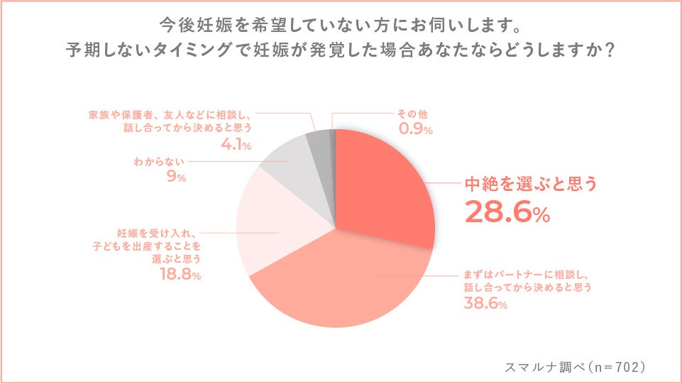 続いて、今後妊娠を希望していないと回答した人に「もし予期しないタイミングで妊娠がわかった場合、あなたならどうするか」と伺ったところ、「まずはパートナーに相談し、話し合ってから決めると思う」(38.6%)、「中絶を選ぶと思う」(28.6%)、「妊娠を受け入れ子どもを出産することを選ぶと思う」(18.8%)でした。予期せぬ妊娠が起こった際、妊娠を希望していない人においては約3人に1人が「中絶を選ぶと思う」と回答していることがわかりました。