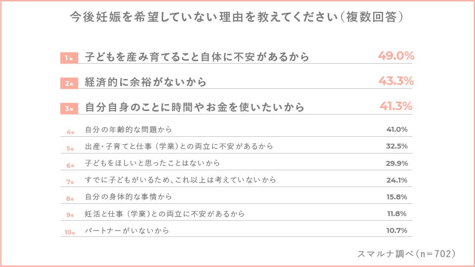妊娠を希望していない理由は「子どもを産み育てること自体に不安があるから」が49%。次いで「経済的に余裕がないから」「自分自身のことにお金や時間を使いたいから」