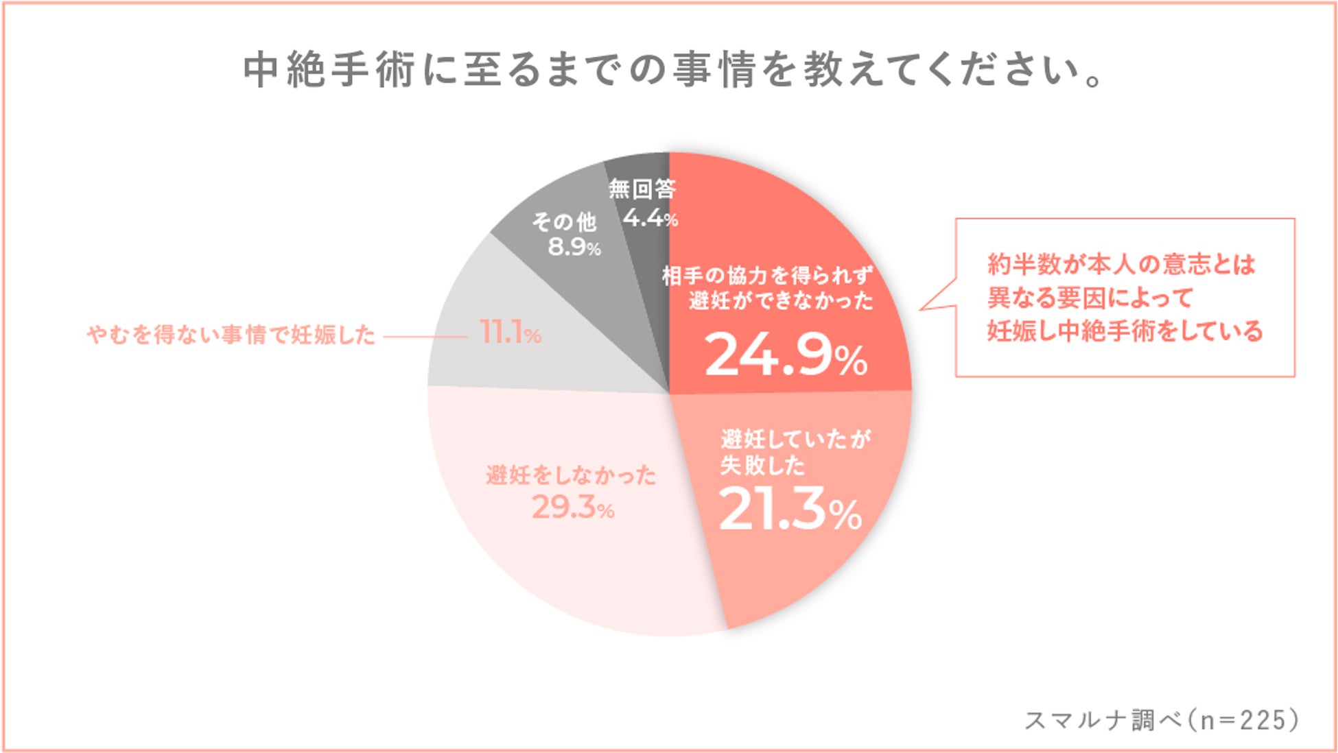 中絶手術に至るまでの事情については「相手の協力が得られず避妊できなかった」24.9%、「避妊していたが失敗した」21.3%と、約半数が本人の意志とは異なる要因やトラブルによって起こっている