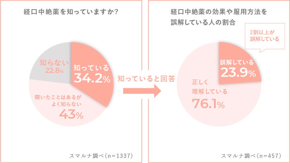 経口中絶薬を「知っている」と回答した人は34.2%、「聞いたことはあるがよく知らない」と回答した人は43%でした。経口中絶薬を知っていると回答した人のうち、76.1%が正しい知識を持っており関心の高さが伺える結果となりましたが、中には「100%中絶できる」「1錠服用するだけで中絶することができる」「どこの病院でも産婦人科医から処方してもらうことができる」など誤解もあることがわかりました。
