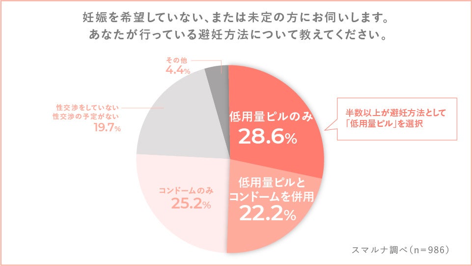 今後妊娠を希望していない人の避妊法は「低用量ピルのみ」が28.6%、次いで「コンドームのみ」25.2%、「コンドームと低用量ピルを併用」22.2%。半数以上が避妊法として低用量ピルを使用