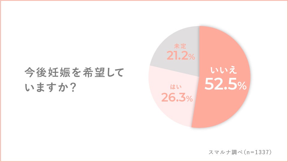 まず、今後の妊娠意向について調査したところ「今後妊娠を希望している」と回答した人は26.3%、「希望していない」と回答した人は52.5%となり、半数以上が今後妊娠を希望していないことが明らかになりました。