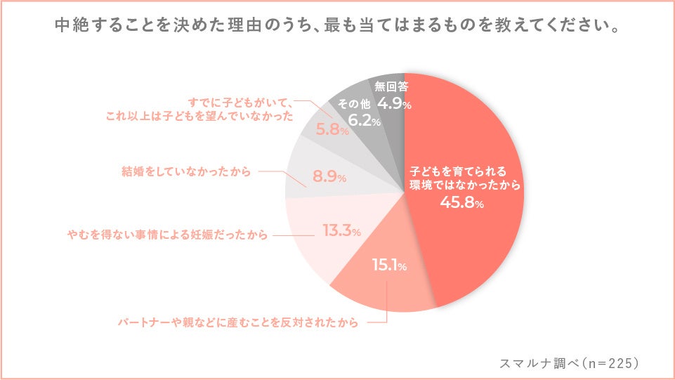 中絶手術を決めた理由のうち最も高かったのは「子どもを育てられる環境ではなかったから(経済面や生活面などから)」が45.8%で約半数を占め、次いで「パートナーや親などに産むことを反対されたから」(15.1%)、「やむを得ない事情による妊娠だったから」(13.3%)でした。