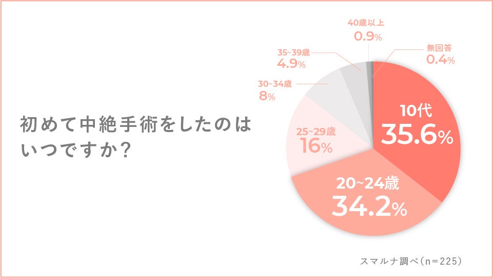初めて中絶手術を行った年齢は、10代が最も高く35.6%、次いで20〜24歳が34.2%となり、10代〜24歳で初めて中絶手術を行った人が約7割を占めています。