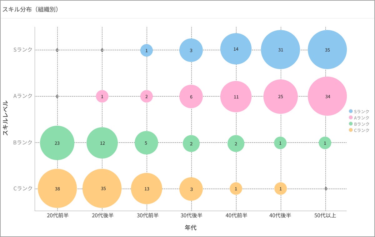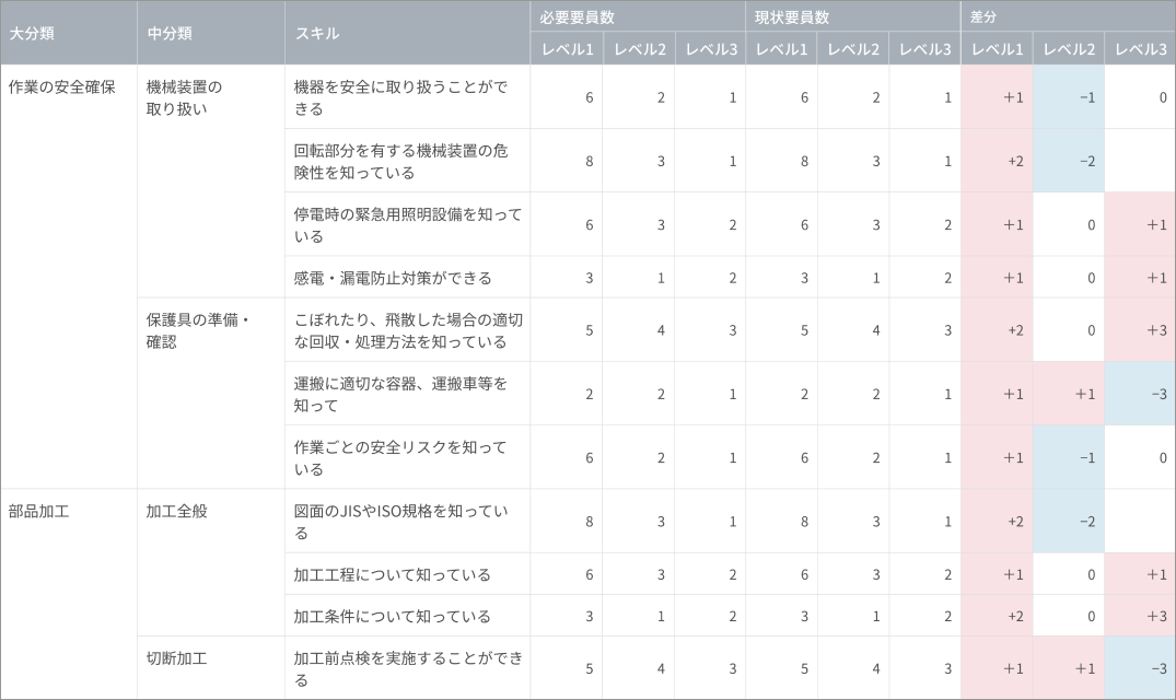 タレントパレットには任意のスキルテンプレートを取り込むことが可能であり、各企業の力量管理表をインポートし、簡易にシステム化のベースを構築できます。そして、各組織の目標に照らし、力量ごとにどのレベルのメンバーが何名必要かという情報と現状レベルとのギャップ、時系列でのレベル推移などを自動的に可視化することができます。これにより、インプット情報を用意・作成する手間をなくし、各組織のマネージャーは「人的資源の増減への対応計画」や「力量を備えるための人材育成計画」の検討に注力していただけます。