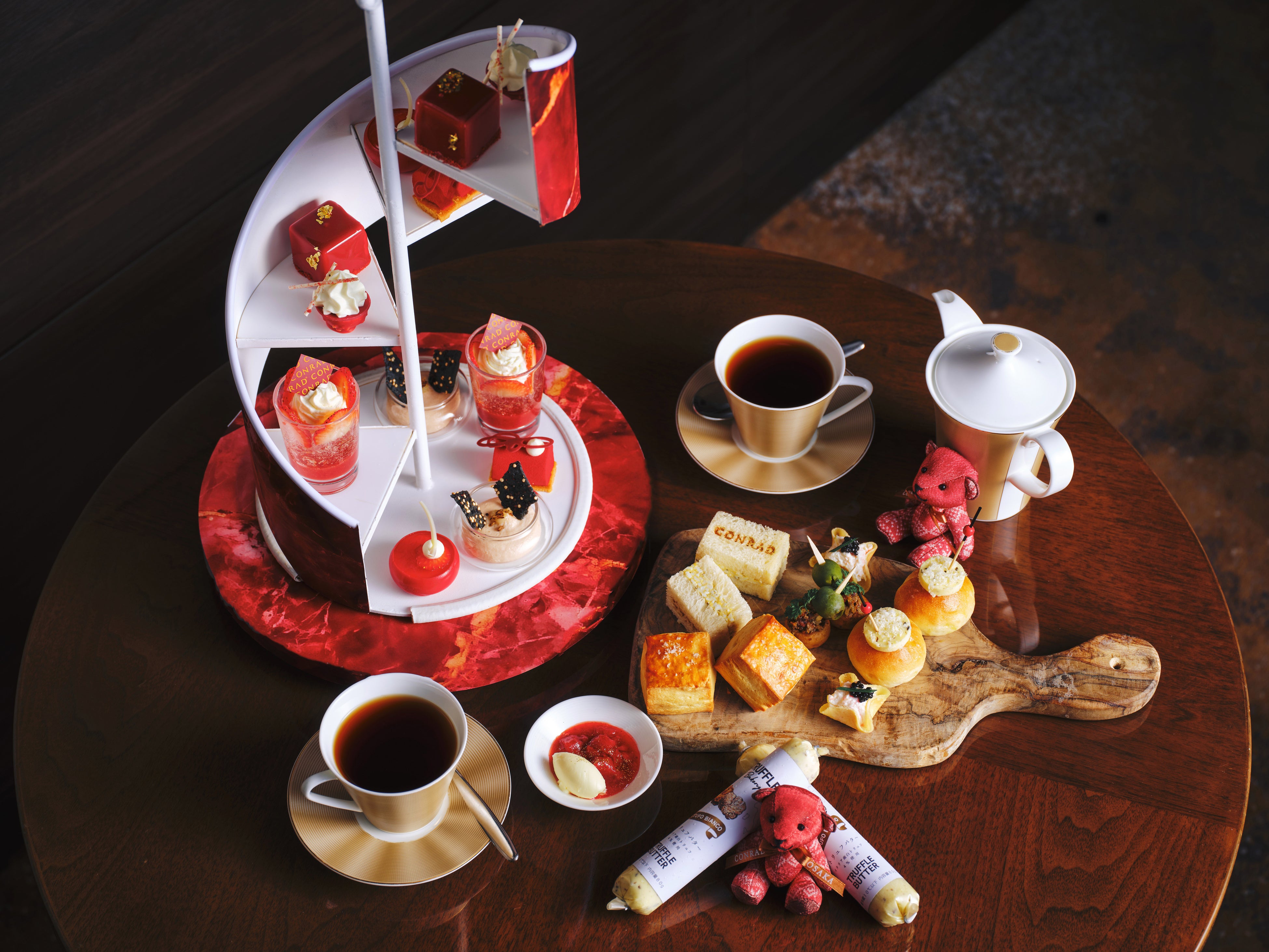 コンラッド大阪(大阪市北区中之島、総支配人マルコ・ティラフェリ)「40スカイバー&ラウンジ」では、人気ベーカリーTruffleBAKERY(トリュフベーカリー)のレシピを使用したコラボレーションセイボリーと、ストロベリーをベルガモットやカモミール、黒胡椒などトリュフと相性の良い素材でアレンジしたスイーツを楽しめる「ウィンター・ストロベリーアフタヌーンティー with TruffleBAKERY」を2024年12月16日(月)~2025年2月28日(金)の期間中毎日開催します。2024-25年秋冬トレンドカラーのバーガンディーを基調としたティースタンドで冬の新作スイーツ6種類とセイボリー5種類、計11種類のメニューをお楽しみください。
