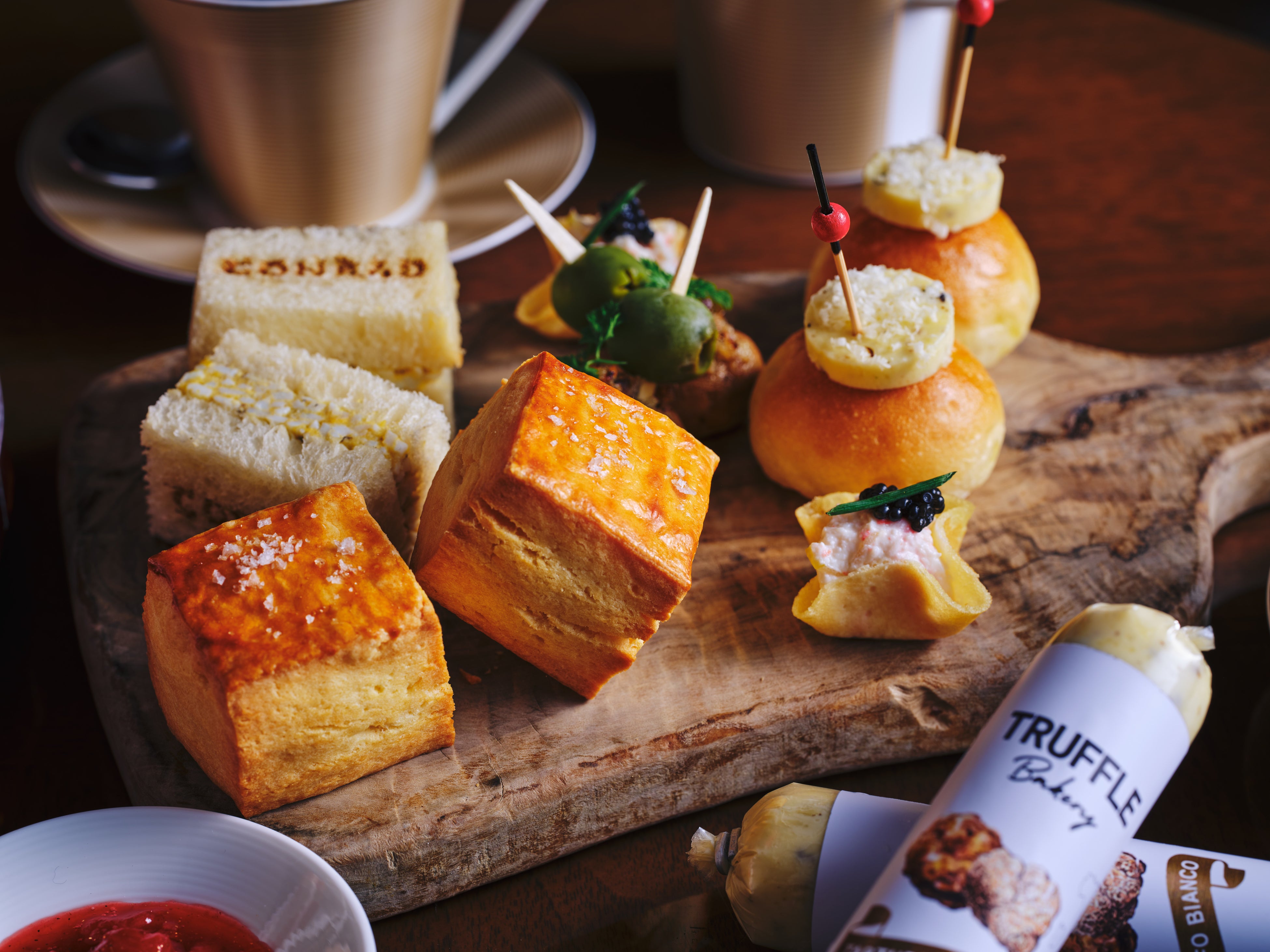 セイボリーには、TruffleBAKERYオリジナルのパン生地で焼き上げた塩パンに白トリュフバターを載せ、トリュフ風味のマカダミアナッツを削って仕上げた「塩パンと白トリュフバターマカダミアナッツ」や、TruffleBAKERYオリジナルの黒トリュフの卵フィリングのレシピを採用し、アニマルウェルフェアに取り組む京都の平飼い卵を使用したコンラッドの文字が映えるアイコニックな季節のサンドイッチをご用意。フィリングには黒トリュフペーストを贅沢に混ぜ込んでいます。その他、季節の食材とトリュフにインスパイアされ、世界三大高級食材のキャビアをズワイ蟹と合わせたセイボリー「ズワイ蟹のクレープ」や、旬のすだちやマッシュルームを使用した、ワインやシャンパンにもよく合う「マッシュルームタルト」、さらに、“持続可能性のある本質的な食材を”というTruffleBAKERYの哲学に共感し、サステナブル認証を受けたサーモンを使用したリエットをご用意しました。レモンの酸味と甘みがクミンのスパイシーさと絶妙に絡み合い、複雑でバランスの取れた味わいが楽しめます。