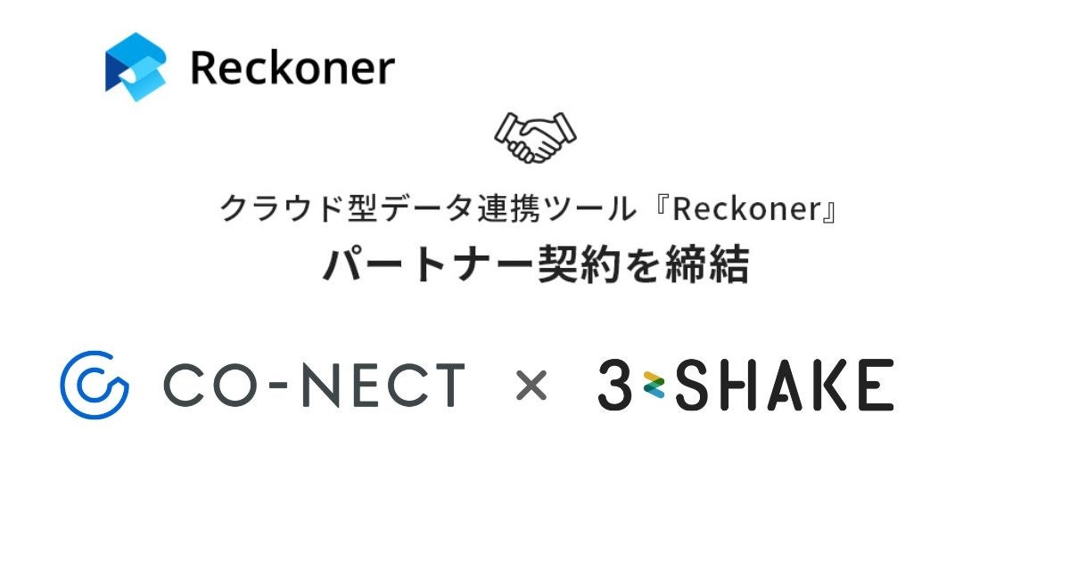 株式会社スリーシェイク(本社:東京都新宿区、代表取締役社長:吉田 拓真、以下スリーシェイク)は、CO-NECT株式会社(本社:東京都千代田区、代表取締役:⽥⼝ 雄介、以下CO-NECT)と、クラウド型データ連携ツール「Reckoner(レコナー)」において、パートナー契約を締結したことをお知らせします。