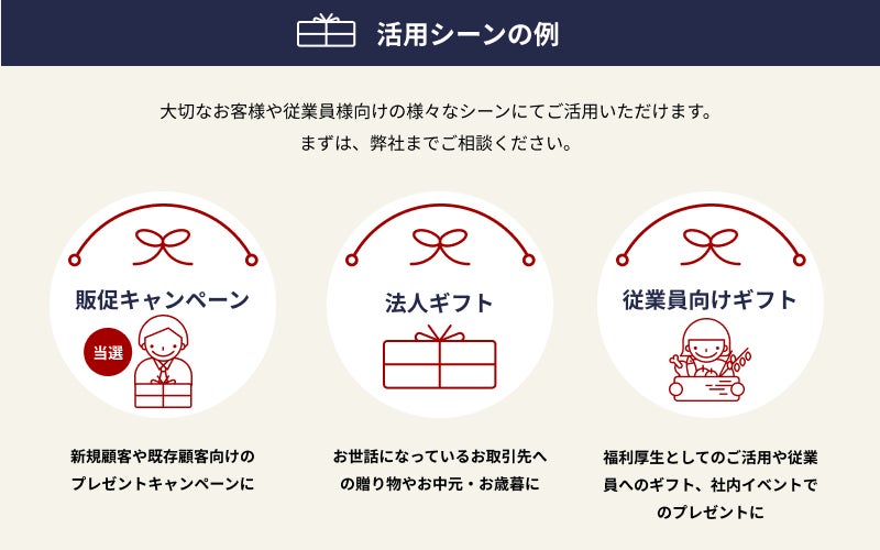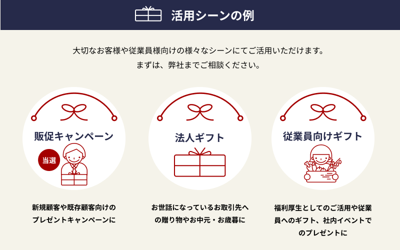 ・従業員向けギフト:福利厚生としてのご活用や従業員へのギフト・社内イベントでのプレゼントに