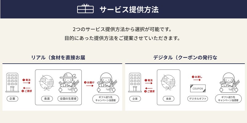 実際に直接指定のお届け場所に食材のお届けするプランと食べチョクで使えるクーポンの発行によるデジタルで対応するプランの2つから選択できます。