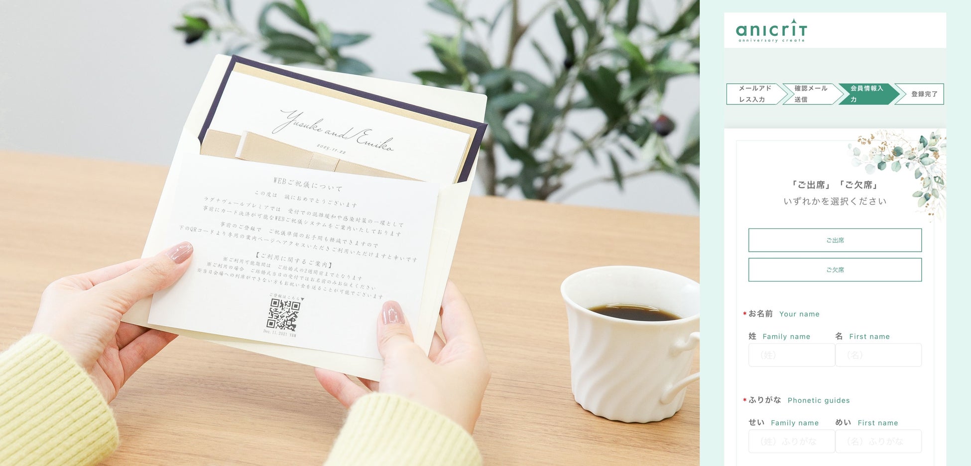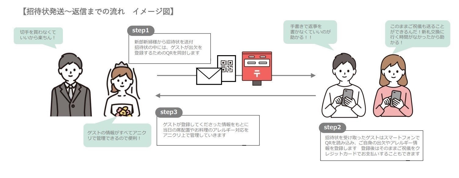 新郎新婦は“海外在住のゲストにはオンラインで招待しよう”、“大親友は絶対当日来てほしいからリアル参列に招待したい。でもやむを得ず欠席になった場合はオンライン参列も検討してほしい”、などゲストの事情を考えた招待方法を選択することが可能です。また招待状は従来の“冠婚葬祭”マナーを重んじ紙で発送いたしますが、返信は当社独自の結婚式準備サイト「anicrit(アニクリ)(※2)」のWEBページを利用することでゲストの出欠席やパーソナル情報の一元管理もでき、結婚式準備の負担軽減が可能です。