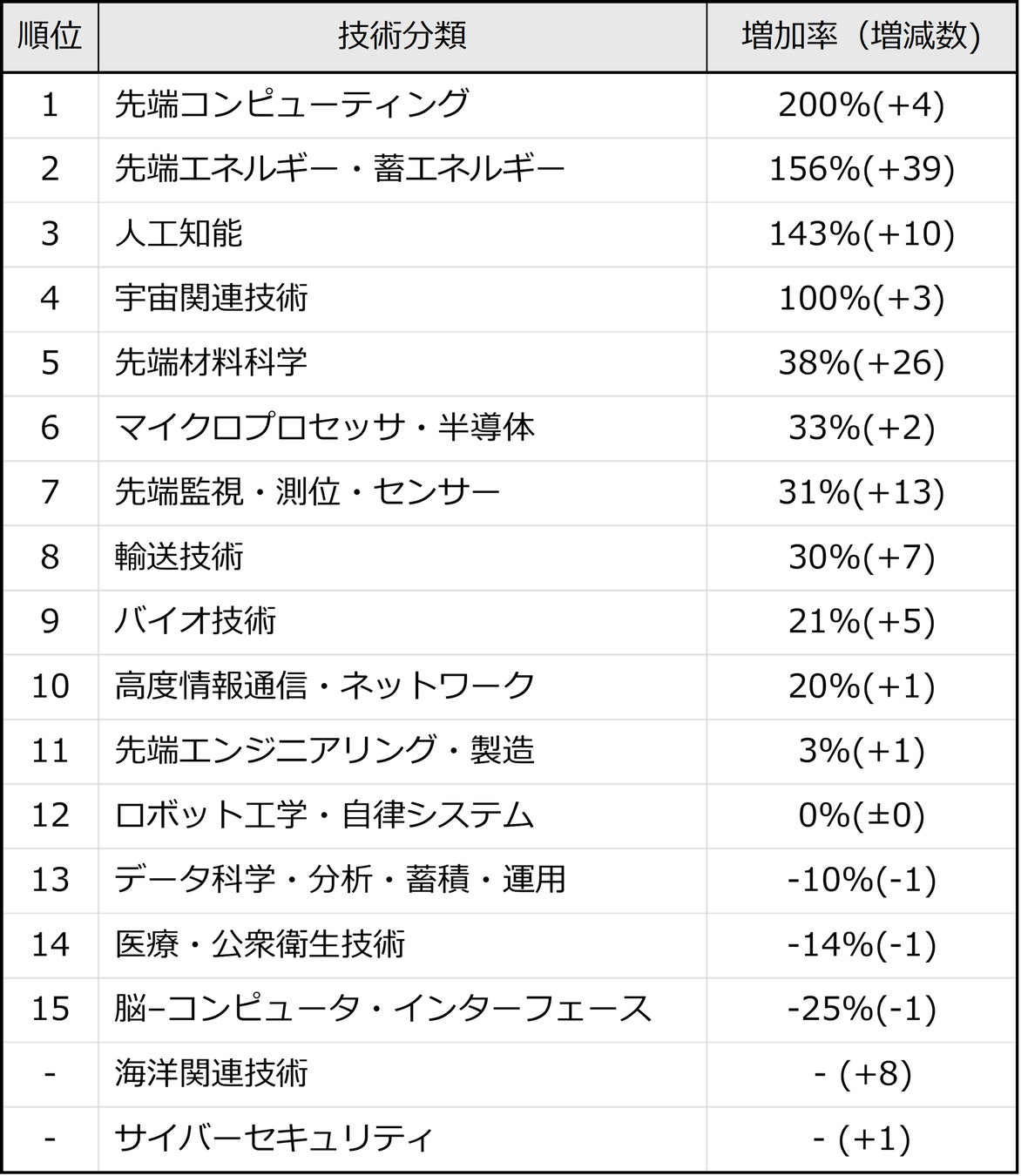 分析方法:「人工知能」「先端材料科学」「バイオ技術」など20の技術カテゴリに分類し、2021年~2024年における調査テーマの増減数、増減率を算出。