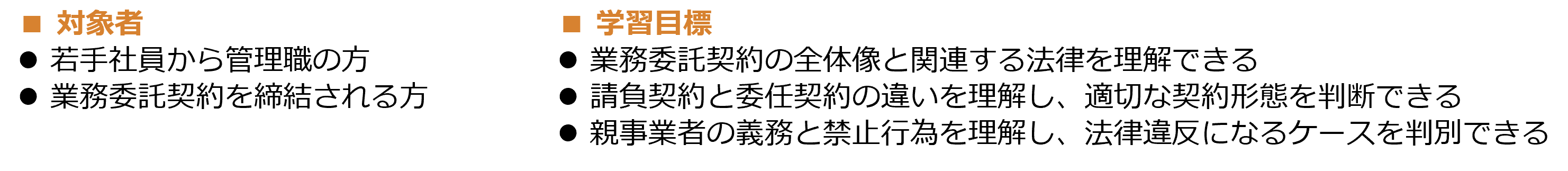 本コースは、業務委託契約に関わる方が、日頃から注意する必要のある法律のポイントを効率的に学べるeラーニングコースです。業務委託契約の全体像をつかんだ上で、関連する下請法や独占禁止法のポイントを学べるため、効率的に業務委託契約の注意点をご理解いただけます。また本コースには、ケースを想定した確認テストが付いているため、法律違反になるケースを判別できるようになります。気づかずに法律違反をしないように、ぜひ本コースを自社のコンプライアンス強化としてご活用ください。