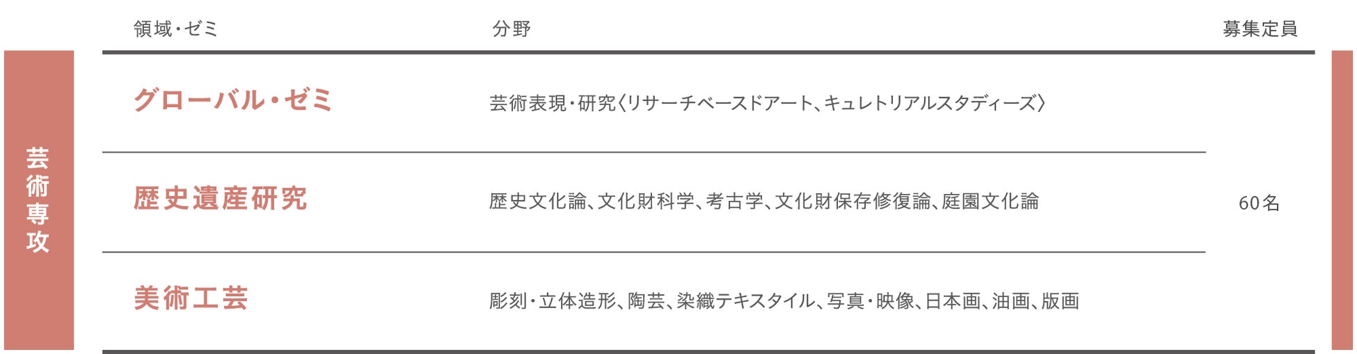 学科編成:4学科16コース(芸術教養学科、芸術学科、美術科、デザイン科)