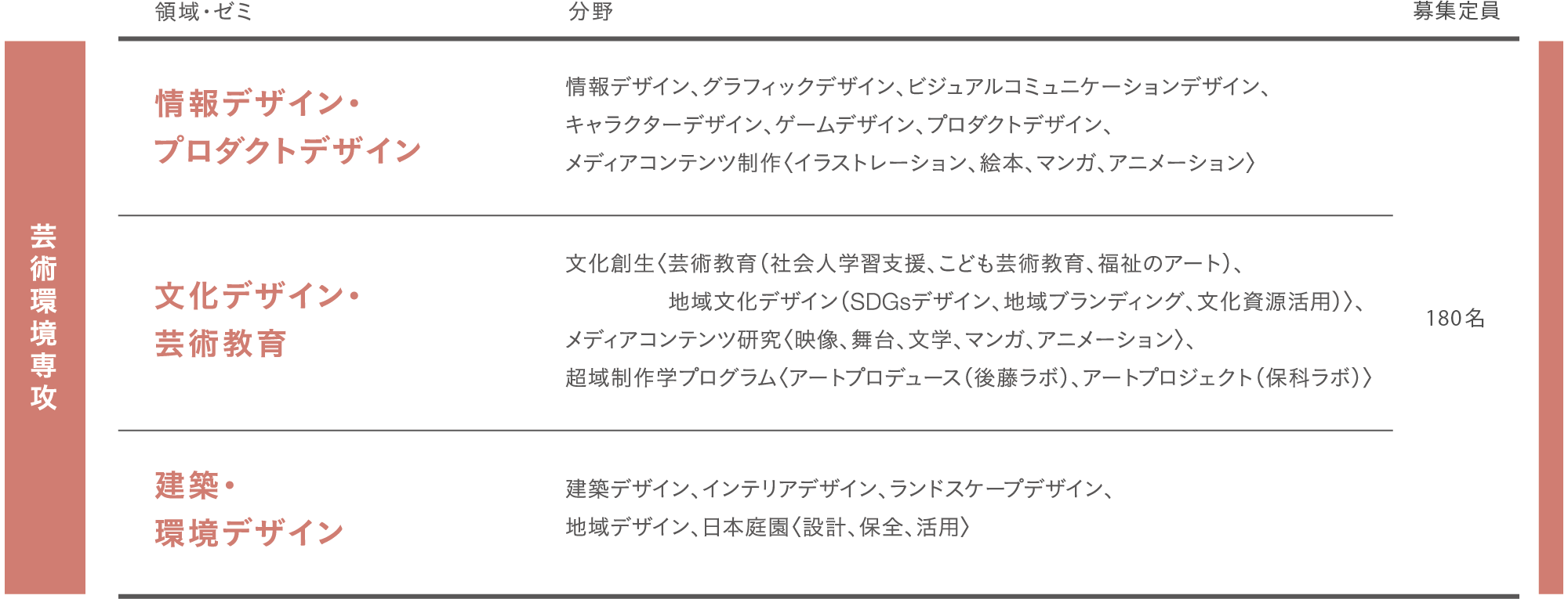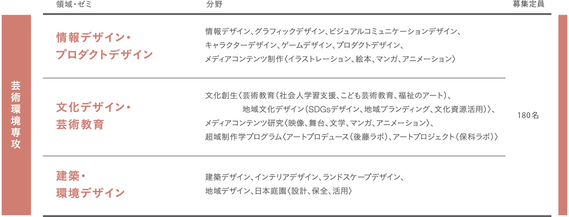 学科編成:13学科23コース(美術工芸学科、マンガ学科、キャラクターデザイン学科、情報デザイン学科、プロダクトデザイン学科、空間演出デザイン学科、環境デザイン学科、映画学科、舞台芸術学科、文芸表現学科、アートプロデュース学科、こども芸術学科、歴史遺産学科)
