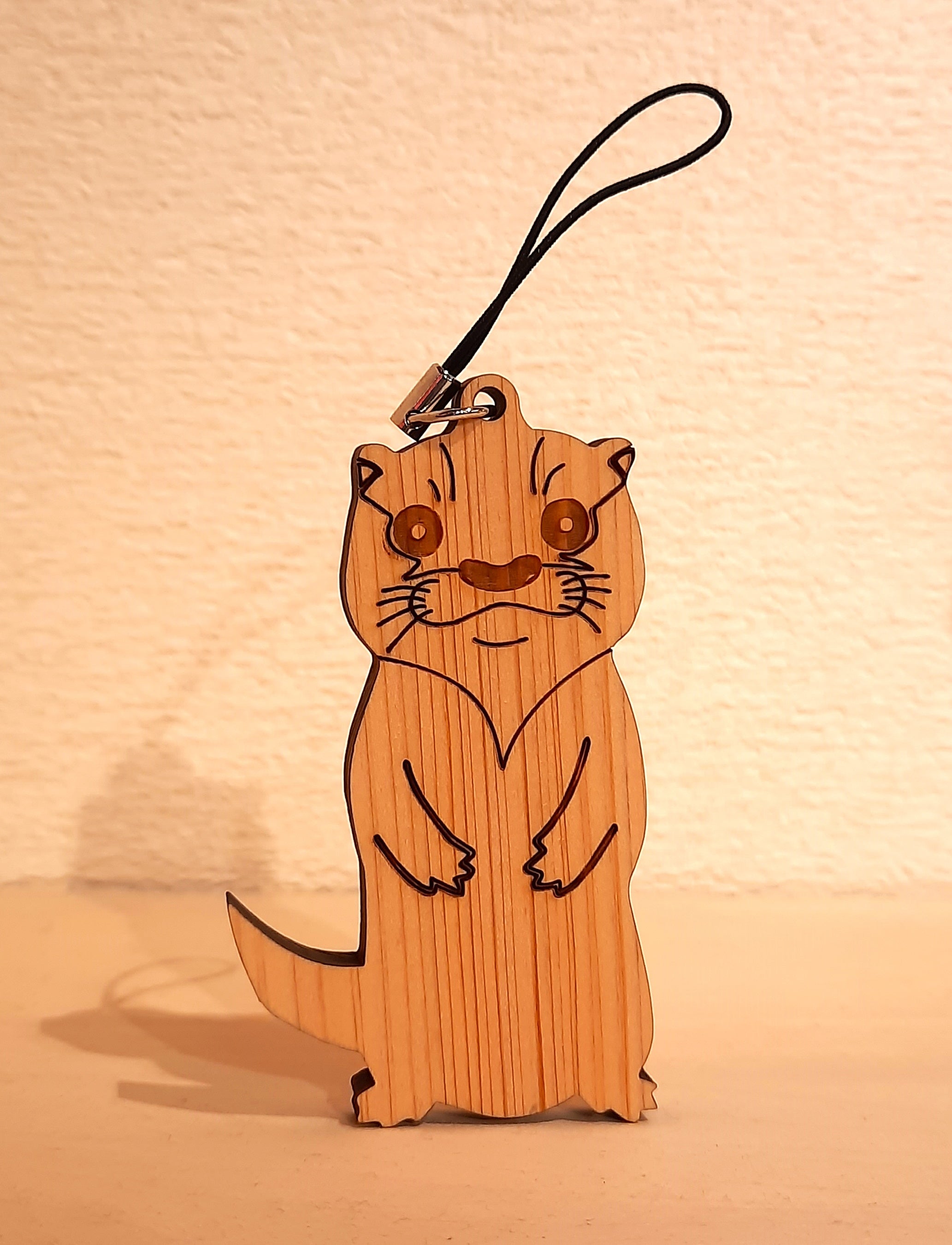 伊勢シーパラダイスのカワウソを担当する飼育スタッフがデザインし、木工職人さんが1つずつ丁寧に制作したオリジナルストラップです。ベッドと同じ伊勢檜を使用しています。