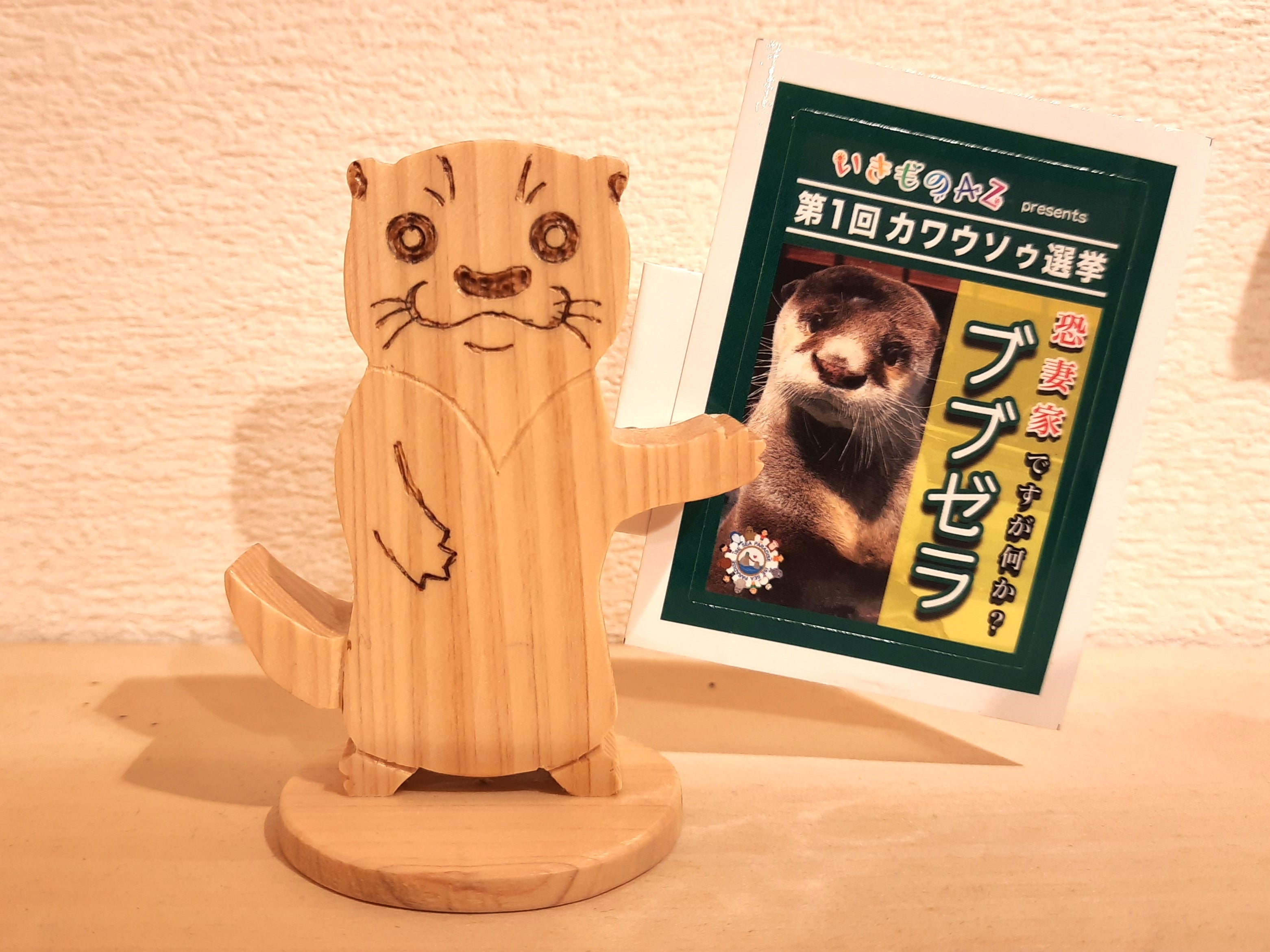 伊勢シーパラダイスのカワウソを担当する飼育スタッフがデザインし、木工職人さんが1つずつ丁寧に制作したオリジナルカードスタンドです。ベッドと同じ伊勢檜を使用しています。