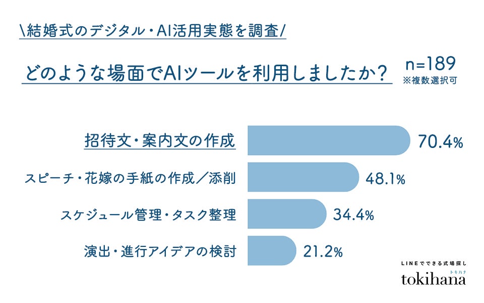 具体的な利用シーンとしては、「招待文・案内文の作成」(70.4%)が最も多く、次いで「スピーチ・花嫁の手紙の作成/添削」(48.1%)、「スケジュール管理・タスク整理」(34.4%)、「演出・進行アイデアの検討」(21.2%)などが挙げられました。