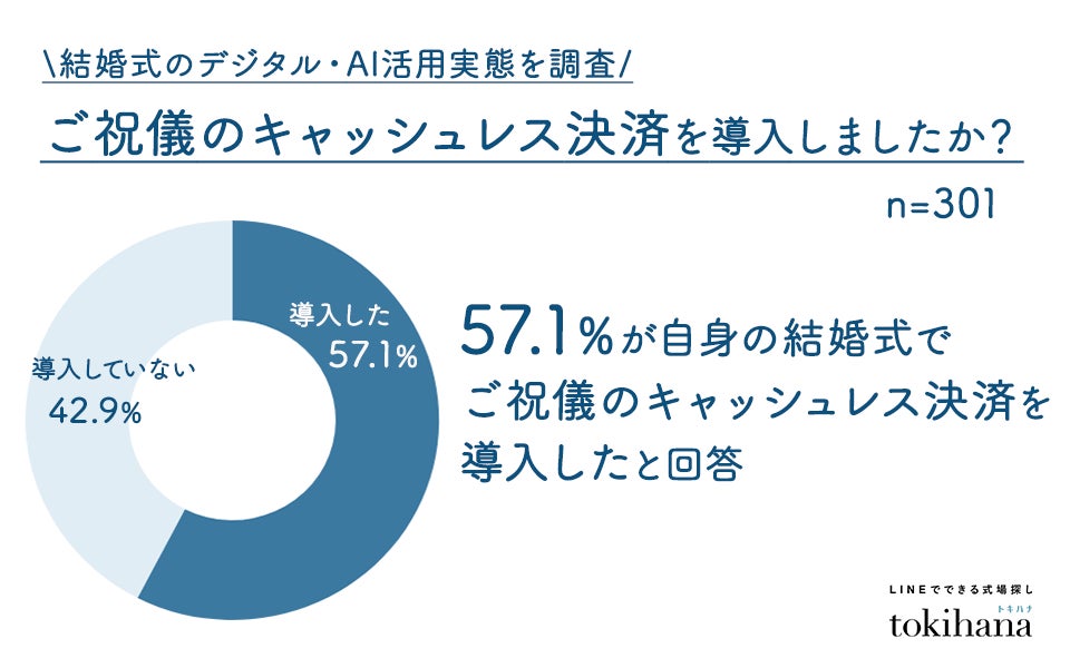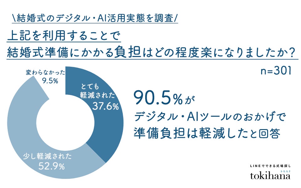 LINEでできる式場探しサービス『トキハナ(https://tokihana.net/)』を運営する株式会社トキハナ(本社:東京都港区、代表取締役社長:安藤 正樹)は、2024~2026年に結婚式を実施した20~30代男女301名を対象に、「結婚式におけるデジタル・AI活用」について調査を実施しました。