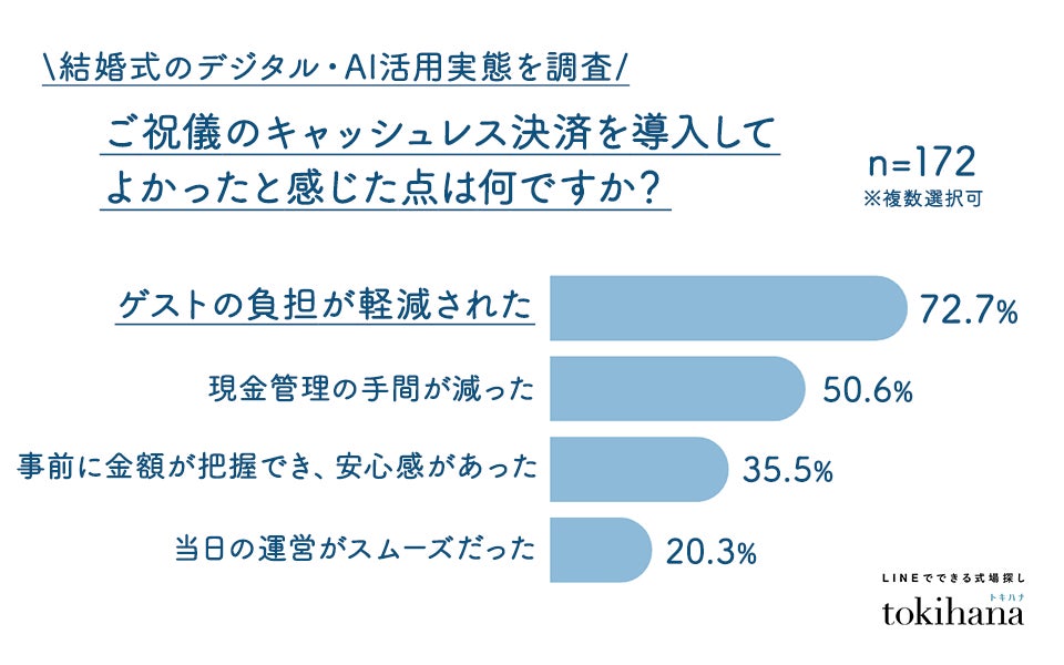 また、導入してよかった点としては、「ゲストの負担が軽減された」(72.7%)、「現金管理の手間が減った」(50.6%)、「事前に金額が把握でき安心感があった」(35.5%)などが挙げられ、“新郎新婦・ゲスト双方の負担軽減”が大きな価値となっていることがうかがえます。