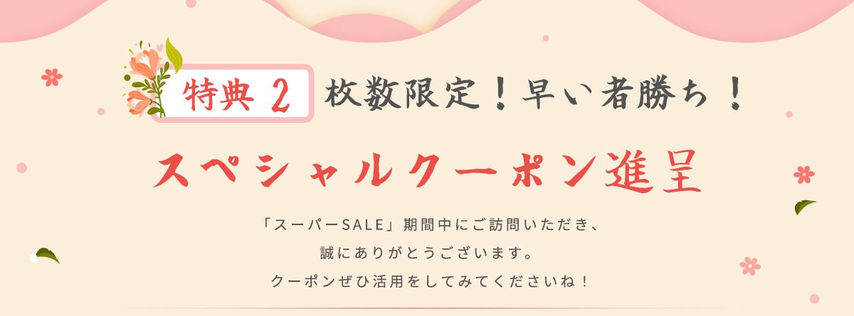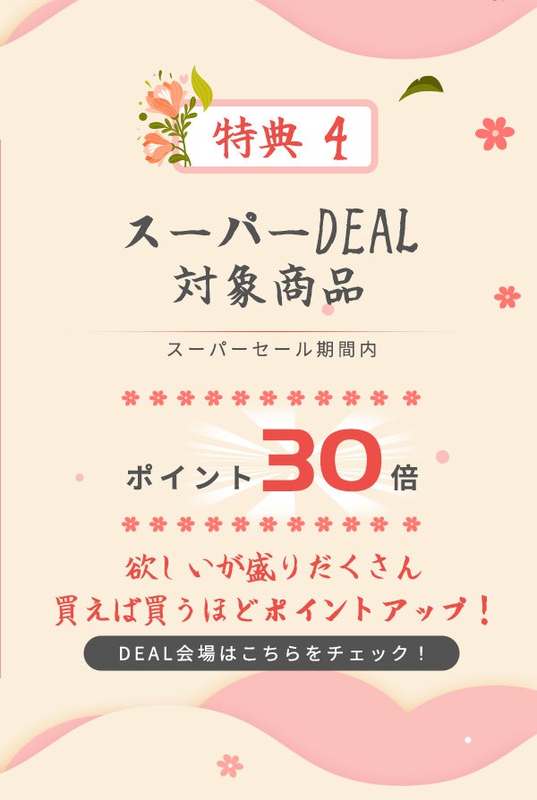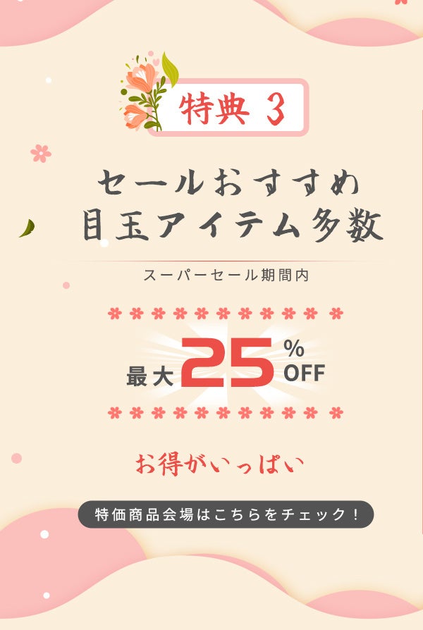 - 内容:スーパーセール最大25%OFFでお得がいっぱい!