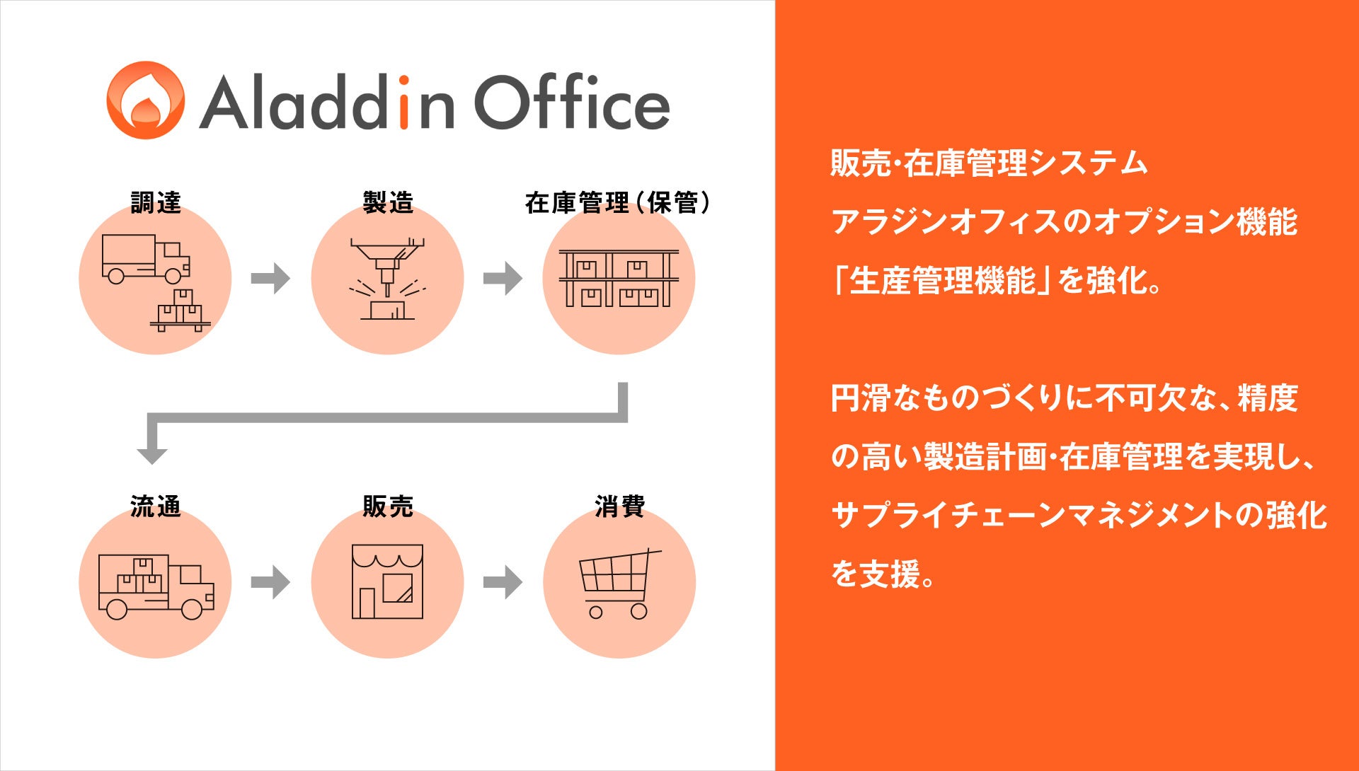こうした動向を受け、製造業の企業さまの業務をトータルでサポートできるよう、販売・在庫管理システム「アラジンオフィス」のオプション機能「生産管理機能」を強化しました。