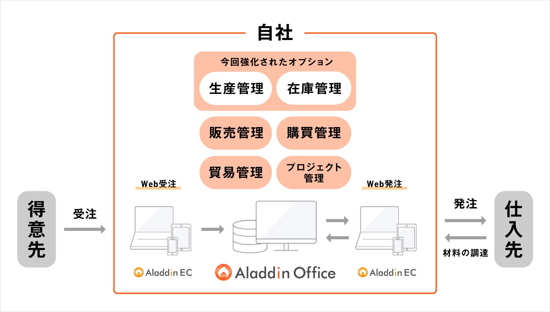 また「アラジンオフィス」の豊富なオプション機能を活用し、アイルが提供するWeb受発注システム「アラジンEC」と組み合わせることで、より包括的な業務管理が可能です。