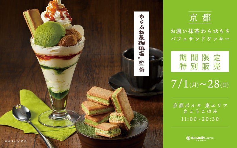 株式会社寿庵より、「からふね屋珈琲店」監修の「京都 お濃い抹茶わらびもちパフェサンドクッキー」が、7月1日(月)~7月28日(日)の期間、JR京都駅「京都ポルタ きょうこのみ」に出店いたします!