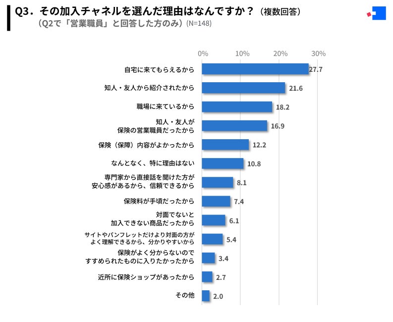 Q2で保険加入チャネルを「営業職員」と回答した方にも、「Q3.その加入チャネルを選んだ理由はなんですか?(複数回答)」(N=148)と質問したところ、「自宅に来てもらえるから」が最多の27.7%、次いで「知人・友人から紹介されたから」が21.6%、「職場に来ているから」が18.2%という結果となりました。