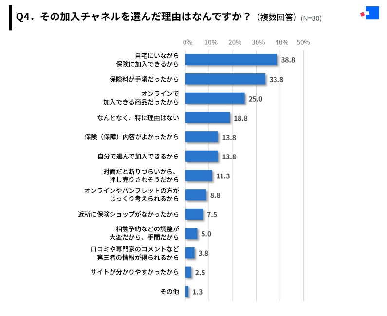 Q2で保険加入チャネルを「インターネット・郵送」と回答した方に「Q4.その加入チャネルを選んだ理由はなんですか?(複数回答)」(N=80)と質問したところ、回答者80名のうち「自宅にいながら保険に加入できるから」が最多の38.8%、次いで「保険料が手頃だったから」が33.8%、「オンラインで加入できる商品だったから」が25.0%という結果となりました。
