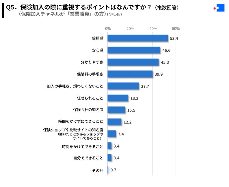 Q2で保険加入チャネルを「営業職員」と回答した方(N=148)が保険加入の際に重視するポイントは、「信頼感」が最多の53.4%、次いで「安心感」が46.6%、「分かりやすさ」が45.3%という結果となりました。