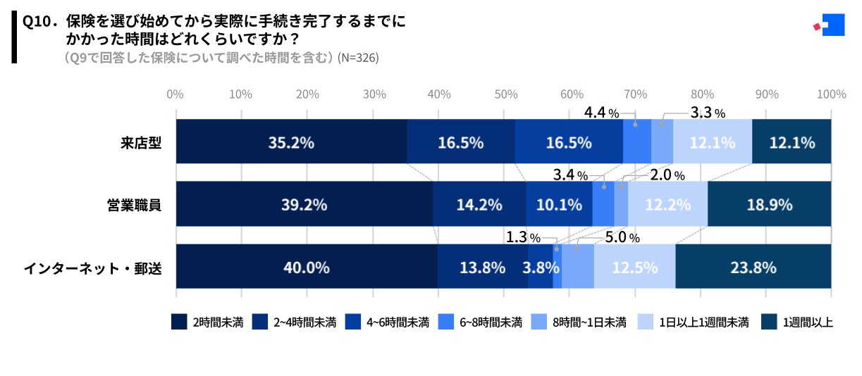 「Q10.保険を選び始めてから実際に手続き完了するまでにかかった時間はどれくらいですか?(Q9で回答した保険について調べた時間を含む)」(N=326)と質問したところ、全体では「2時間未満」が最多の39.0%だった 一方で、「1週間以上」も2割程度でした。