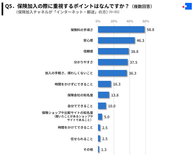 Q2で保険加入チャネルを「インターネット・郵送」と回答した方(N=80)の保険加入の際に重視するポイントは「保険料の手頃さ」が最多の58.8%、次いで「安心感」が46.3%、「信頼感」が38.8%という結果となりました。
