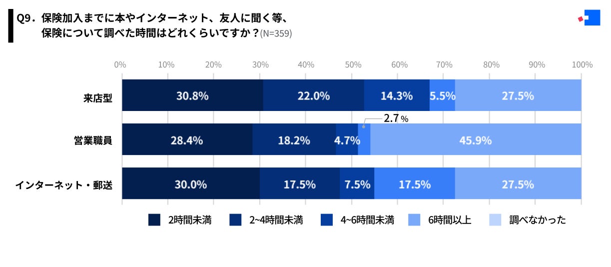 「Q9.保険加入までに本やインターネット、友人に聞くなど、保険について調べた時間はどれくらいですか?」(N=359)と質問したところ、全体では「2時間未満」が27.9%で最多でしたが、一方でそもそも「調べなかった」も39.8%でした。