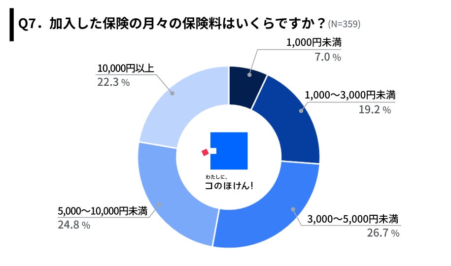 「Q7.加入した保険の月々の保険料はいくらですか?」(N=359)と質問したところ、全体では「3,000~5,000円未満」が26.7%と最多になりました。
