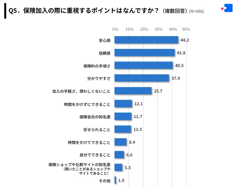 「Q5.保険加入の際に重視するポイントはなんですか?(複数回答)」(N=486)と質問したところ、全体では「安心感」が最多の44.2%、次いで「信頼感」が41.8%、「保険料の手頃さ」が40.5%という結果になりました。