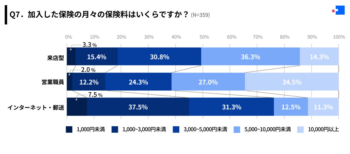 一方で保険加入チャネルごとに見ると、「来店型」チャネルでは「5,000~10,000円未満」が36.3%で最多となり、「営業職員」チャネルでは「10,000円以上」が34.5%で最多となりました。「インターネット・郵送」チャネルでは「1,000~3,000円未満」が37.5%で最多となりました。
