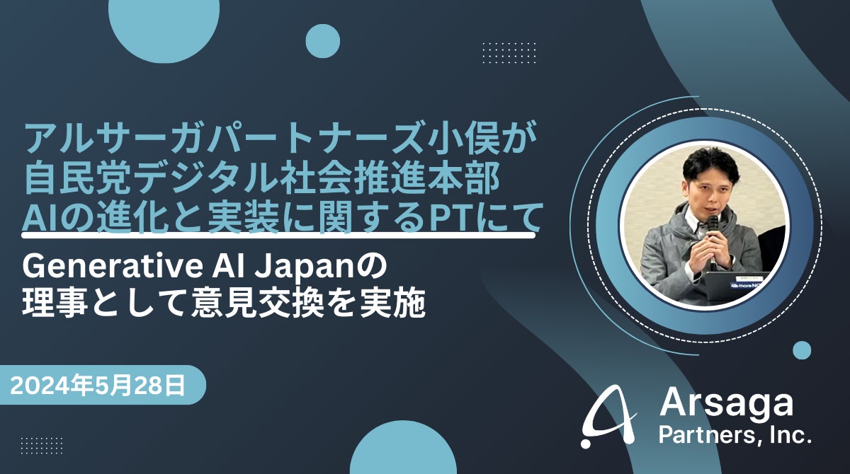 企業のDXを促進するアルサーガパートナーズ株式会社(本社:東京都渋谷区、代表取締役 /CEO・CTO:小俣泰明、以下「アルサーガパートナーズ」)は、2024年5月28日(火)、自民党デジタル社会推進本部 AIの進化と実装に関するPTで、一般社団法人Generative AI Japan(以下「GenAI、読み:ジェナイ」)の理事として弊社代表の小俣が講師として意見交換を行いました。アプリケーション開発力強化に対する体制作りについて発表しました。