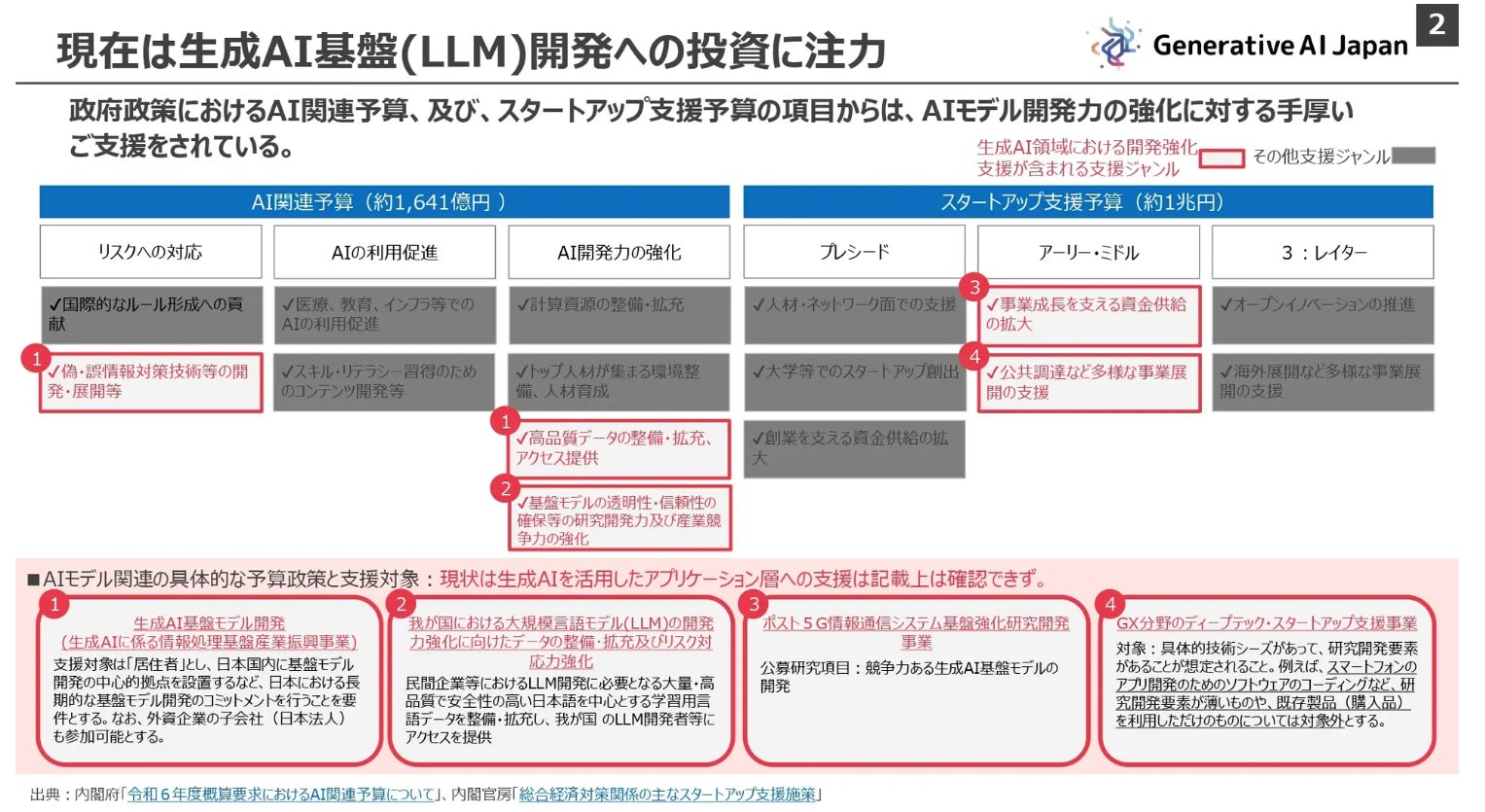 日本におけるAI関連予算や支援項目の現状を背景に、今後の生成AIアプリケーション開発力強化に対する体制づくりについて提案を取りまとめたものです。当日はアルサーガパートナーズ代表の小俣を含め、GenAIから3名とELYZAの代表が登壇し、意見交換の場では活発に意見が交わされました。今回の意見交換を生かし、今後の議論を深めてまいります。
