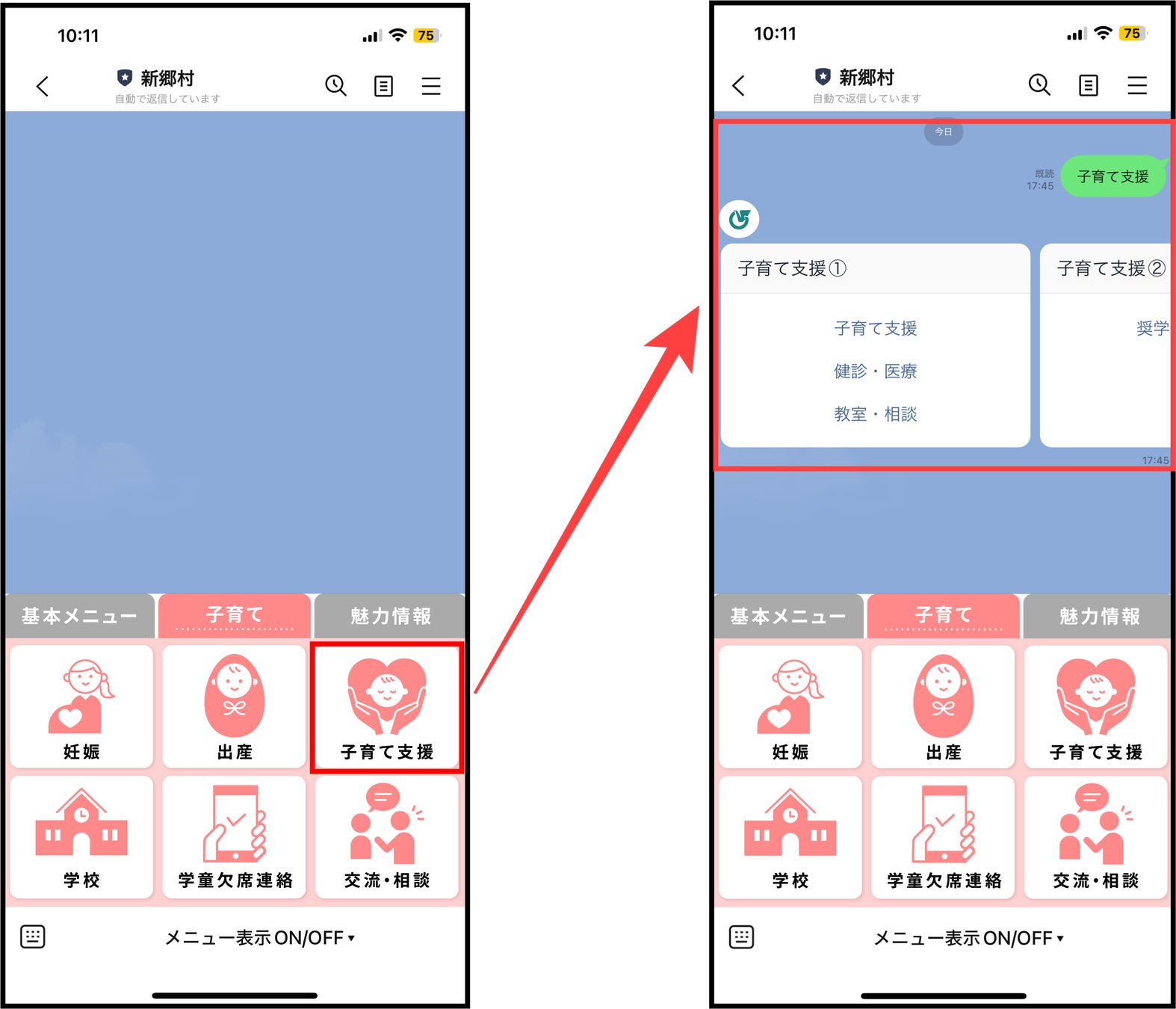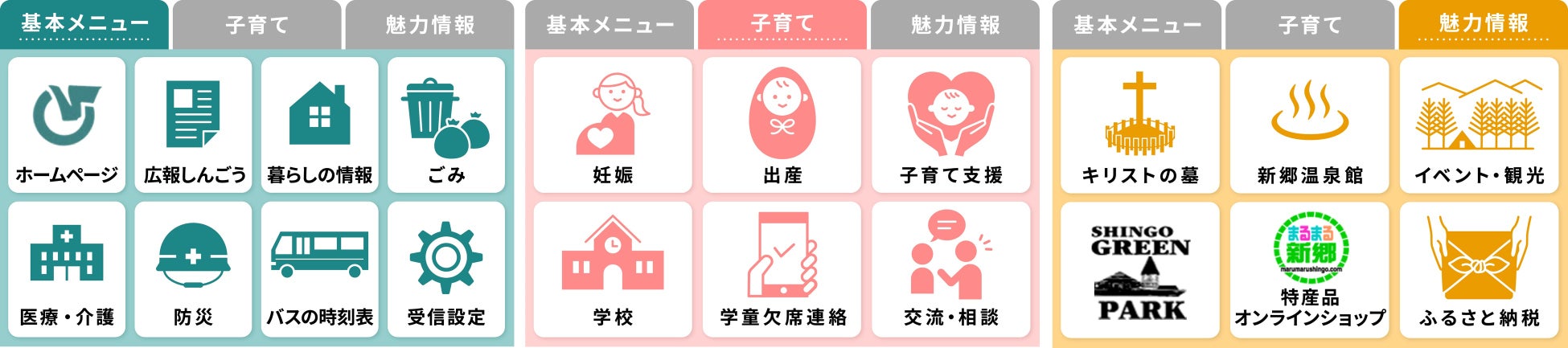 画面下部に表示されるメニューをタブ機能を使うことによち様々なジャンルの情報を提供することが可能となりました。「基本メニュー」「子育て」「魅力情報」の3つのリッチメニューより、各種チャットボットを起動することができます。