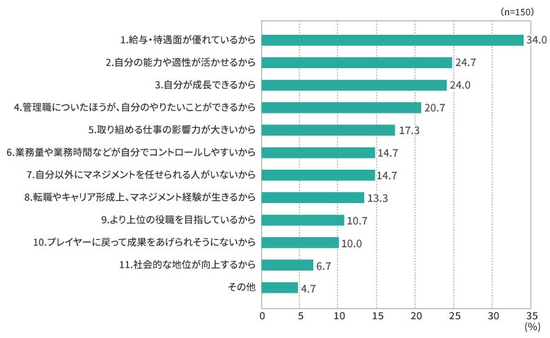 ・管理職を続けている理由では、「1.給与・待遇面が優れているから(34.0%)」が1位となり、業務の難度や負担の大きさに対して、給与・待遇面での対価がないと続けることが難しい立場であると考えられる。