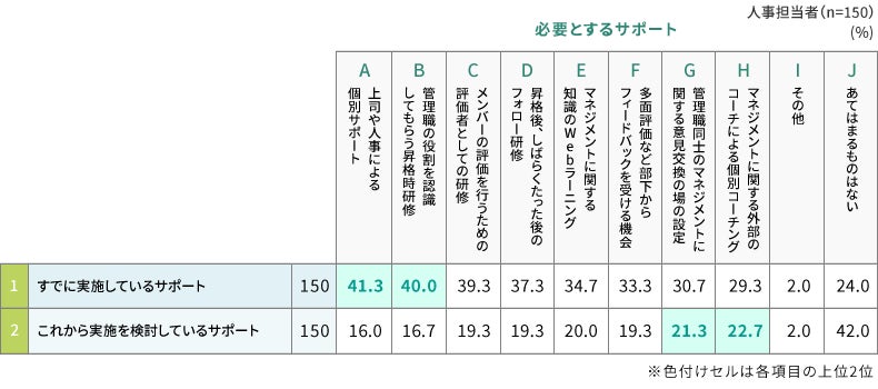 ・人事担当者にすでに実施している管理職へのサポートを尋ねたところ、約4割の企業が「上司や人事による個別サポート」「管理職の役割を認識してもらう昇格時研修」「メンバーの評価を行うための評価者としての研修」を行っていた。
