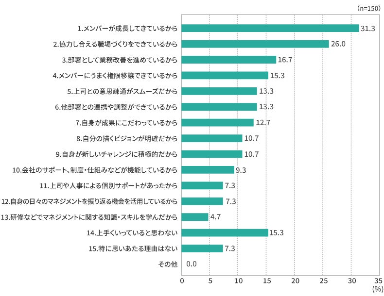 ・管理職として上手くいっている理由では、「1.メンバーが成長してきているから(31.3%)」「2.協力し合える職場づくりをできているから(26.0%)」の割合が特に高いという結果になった。