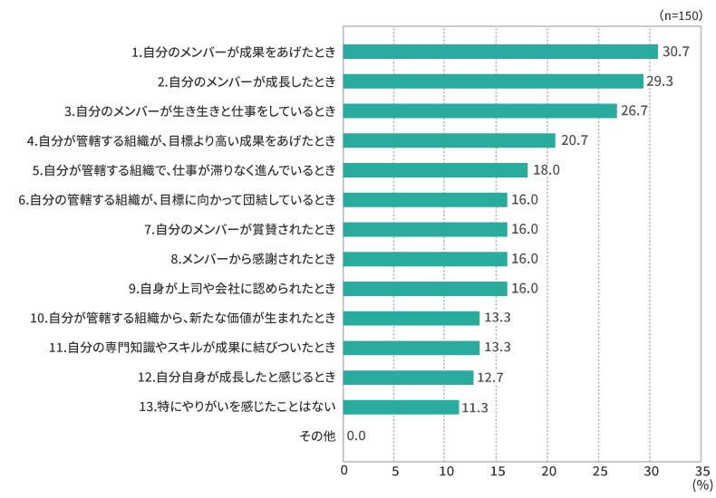 ・管理職としてのやりがいでは、上位から「1.自分のメンバーが成果をあげたとき(30.7%)」「2.自分のメンバーが成長したとき(29.3%)」「3.自分のメンバーが生き生きと仕事をしているとき(26.7%)」の割合が高く、やりがいの中心がメンバーとなっていることが分かる。