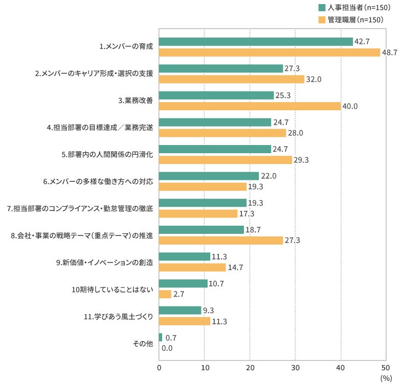 ●人事担当者が管理職に期待していること、管理職層が重要だと考える管理職の役割のトップはともに「メンバーの育成」(図表2)